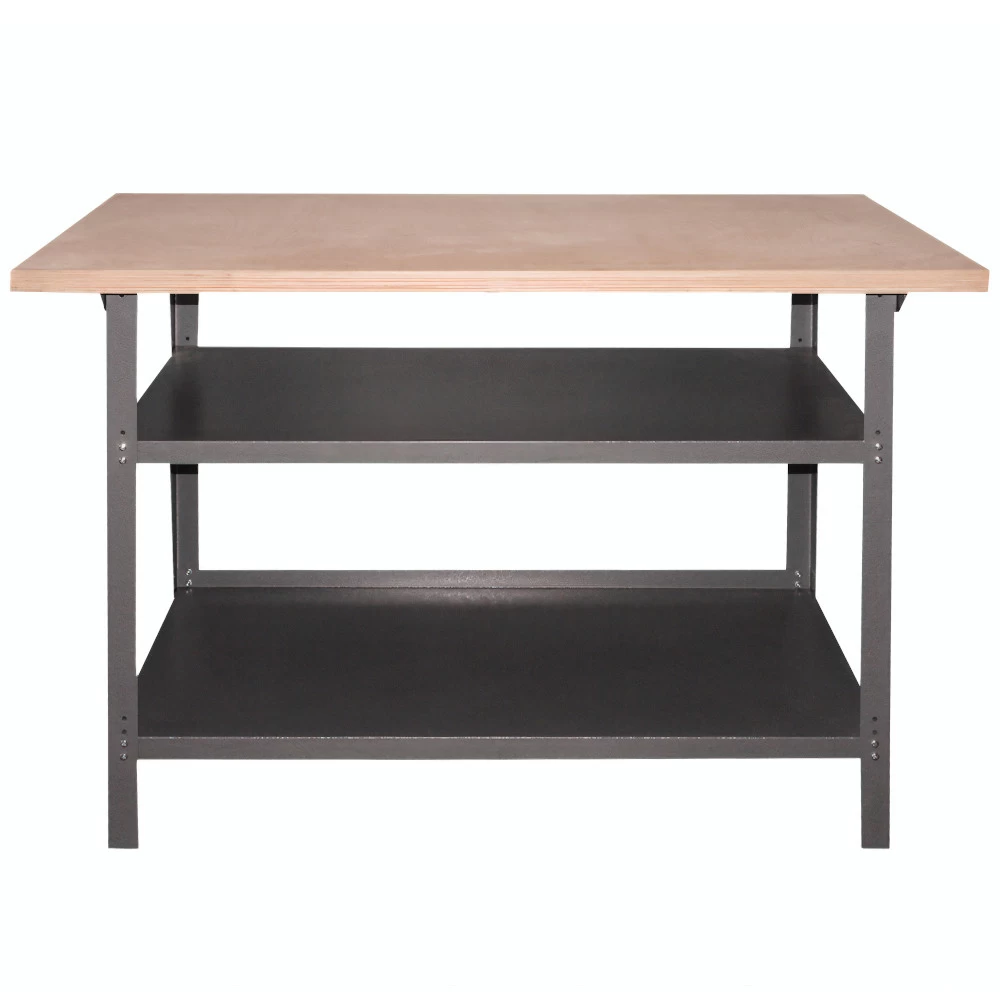 Dieser funktionelle Werkstatttisch hat eine große und massive 3 cm starke Holz-Arbeitsplatte. Unter der Arbeitsplatte befinden sich zwei geräumige Metallböden, die viel Platz für die Lagerung bieten. Der Werkstatttisch ist sehr stabil und kann mit bis zu 300 kg belastet werden.