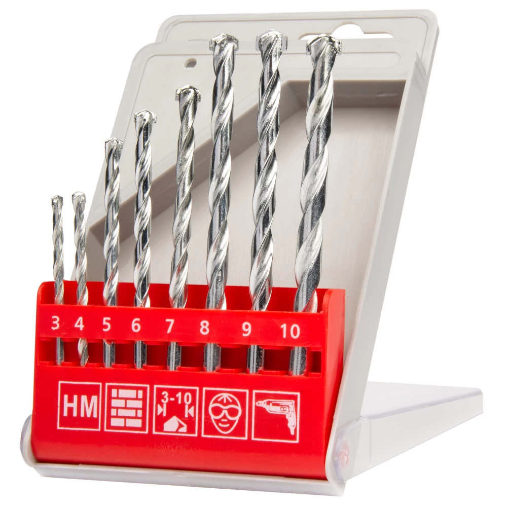 Dieser 8-teilige HM Steinbohrersatz wird in einer praktischen Kunststoffbox geliefert. Die Steinbohrer wurden aus verzinktem Stahl mit HM Schneiden hergestellt.