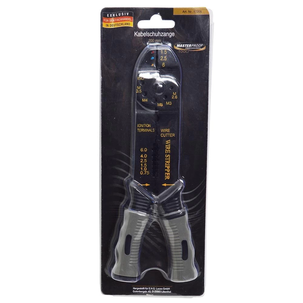 Die Crimpzange ist ein vielseitiges Werkzeug, das zum Verpressen von Kabelschuhen, sowie zum Abisolieren und Schneiden von Kabeln verwendet werden kann. Mit einer Länge von ca. 200 mm und isolierten Griffen liegt die Zange gut in der Hand und ist sicher und komfortabel in der Anwendung. Die Kabelschuhzange kann verschiedene Kabelquerschnitte abisolieren, darunter 0,75 mm², 1,0 mm², 1,5 mm², 2,5 mm², 4,0 mm² und 6,0 mm². Darüber hinaus kann die Zange verschiedene Aderendhülsen wie M 2,5, M 3, M 3,5, M 4 und M 5 sowie Kabelschuhe der Größen 1,5, 2,5 und 6,0 verpressen. Dieses Werkzeug ist ideal für Elektriker, Elektroinstallateure, Mechaniker und andere Fachleute, die häufig Kabelverbindungen herstellen müssen. Die hochwertige Verarbeitung und die robuste Konstruktion gewährleisten eine lange Lebensdauer und zuverlässige Leistung.